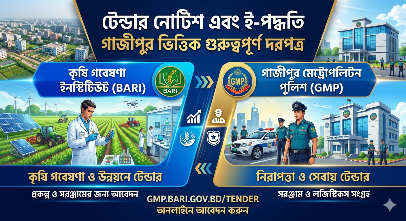 গাজীপুর প্রতিনিধি: দেশের কৃষি উন্নয়ন ও আইন-শৃঙ্খলা রক্ষায় অবকাঠামো ও সরঞ্জাম ক্রয়ের লক্ষ্যে গাজীপুরে দুটি গুরুত্বপূর্ণ সরকারি দপ্তর থেকে নতুন করে টেন্ডার আহ্বান করা হয়েছে। সংশ্লিষ্ট সূত্রে জানা গেছে, বাংলাদেশ…